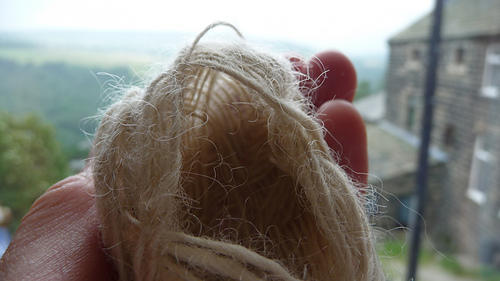Knitting interests me at the moment. I love having the live yarn moving through my fingers, becoming something which will be worn. The top picture shows my handspun yarn. It was spun on a Turkish drop spindle, which makes a centre pull cop of yarn which can be taken off the spindle in one, whole satisfyingly complete ball, ready for plying or knitting. The cop has been emptied out to the last, outer layer, which is now poised and delicate, maintaining its form, fibres still connected, even though all the layers inside have been wound out for use. I will make a lot of these in the weeks to come. A piece of work is forming, between me and it.