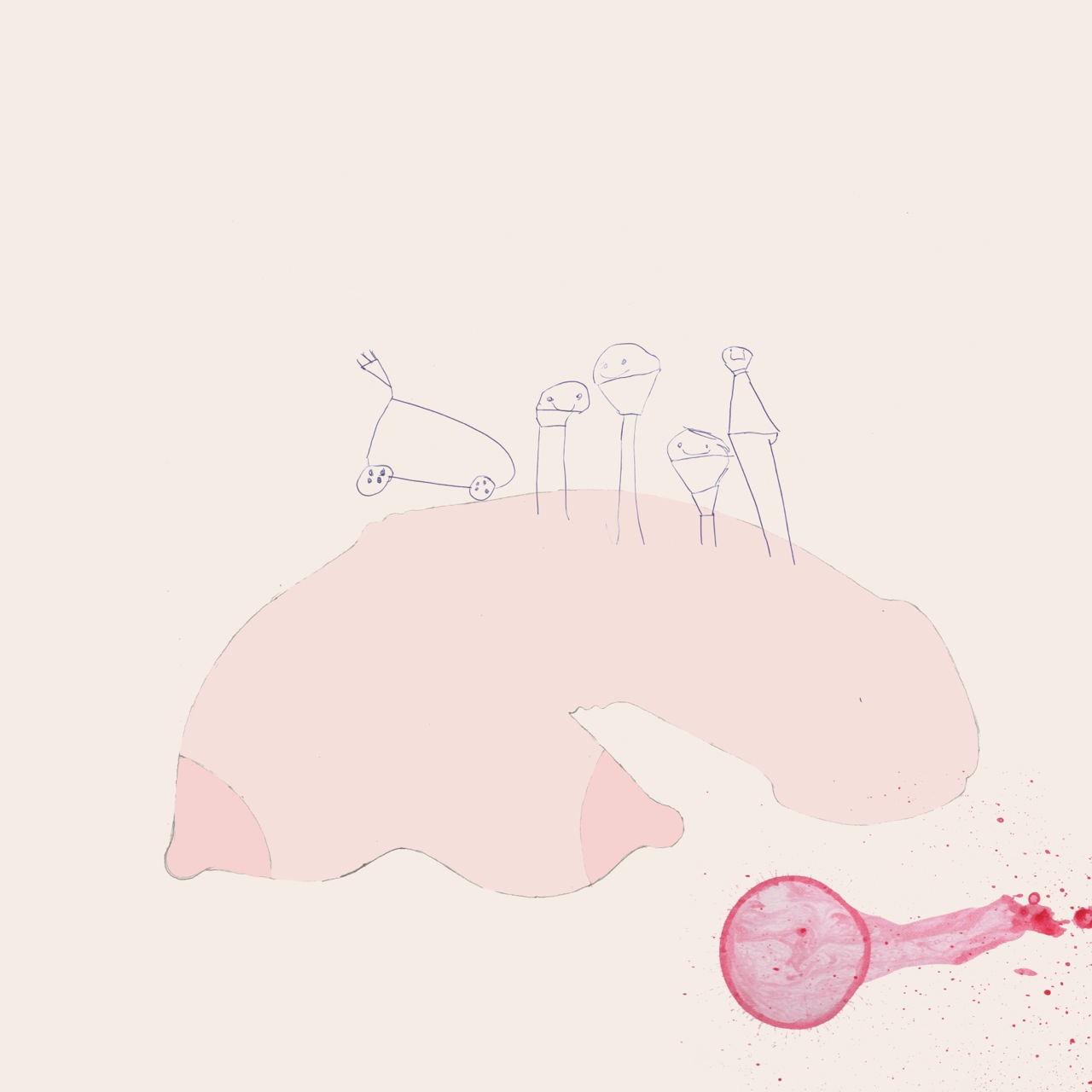 The deep pink broken condom, broken femidom shape, they are both indistinguishable when broken really. Is it actually the disintegration of the womb, is it the end of a period, of a pregnancy… It’s violent and yet soft and floating, a bit like a pin prick or a paper cut. The little droplets of blood fall and appear far worse than the cut itself.